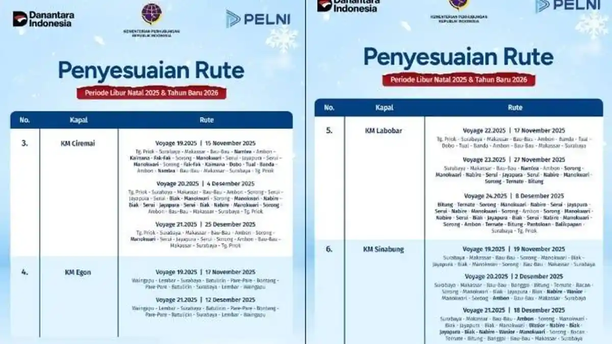 Sedangkan, ada diskon tarif hingga 20 persen berlaku untuk kelas ekonomi pada pembelian mulai 21 November 2025. Untuk keberangkatan 17 Desember 2025 hingga 10 Januari 2026 di semua rute. Tiket bisa dicek dan dipesan via situs resmi Pelni atau aplikasi, dengan layanan praktis seperti check-in online. Rute kapal Pelni dengan perubahan terbesar selama periode Nataru 2025-2026 adalah rute-rute timur Indonesia. Sehingga dimodifikasi meningkatkan frekuensi dan kapasitas, seperti Tanjung Priok-Surabaya – Makassar – Baubau – Ambon – Sorong – Jayapura yang dialihkan pada kapal seperti KM Labobar dan KM Ciremai.